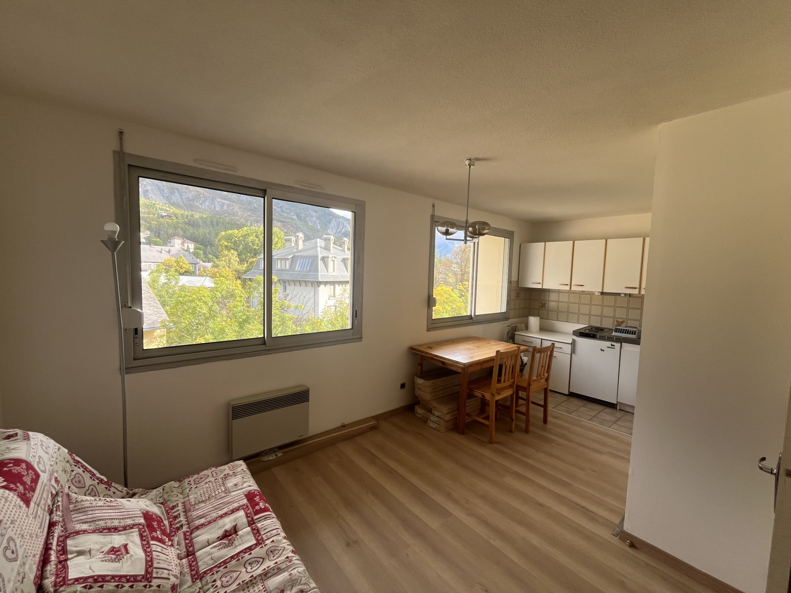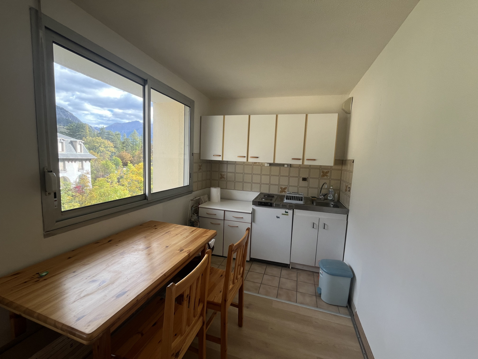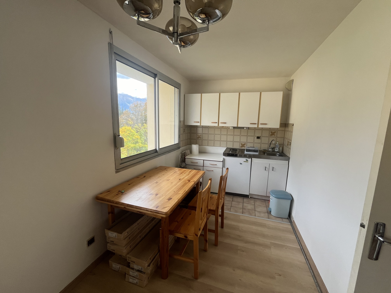 Studio composé d'une entrée sur petit sas, une salle d'eau, un séjour avec coin cuisine , belle vue sur les montagnes